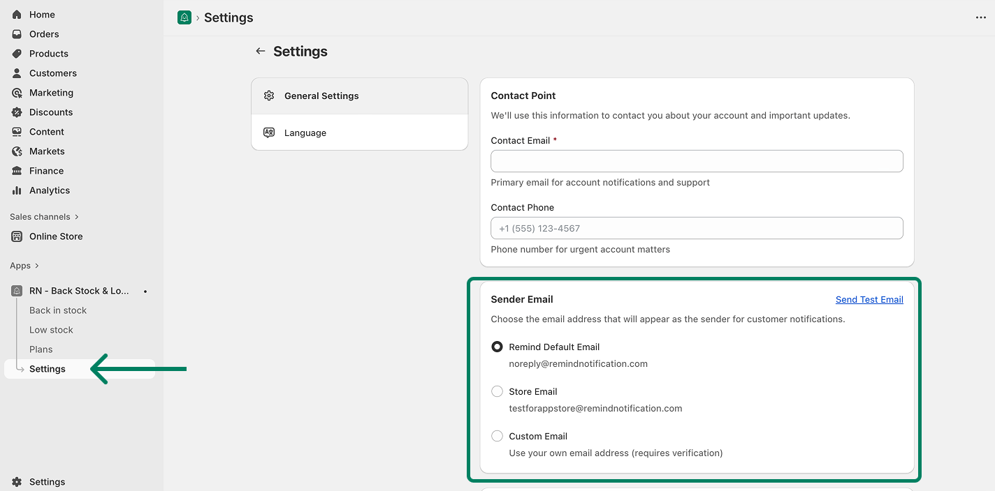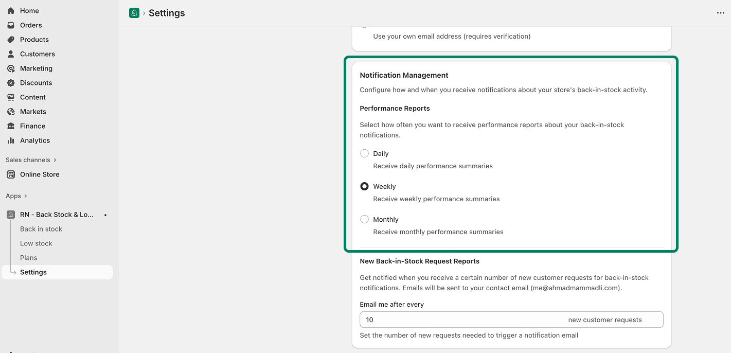 In the Settings section, you can manage your contact information, choose the email sender for notifications, and control how often you receive performance and activity reports.