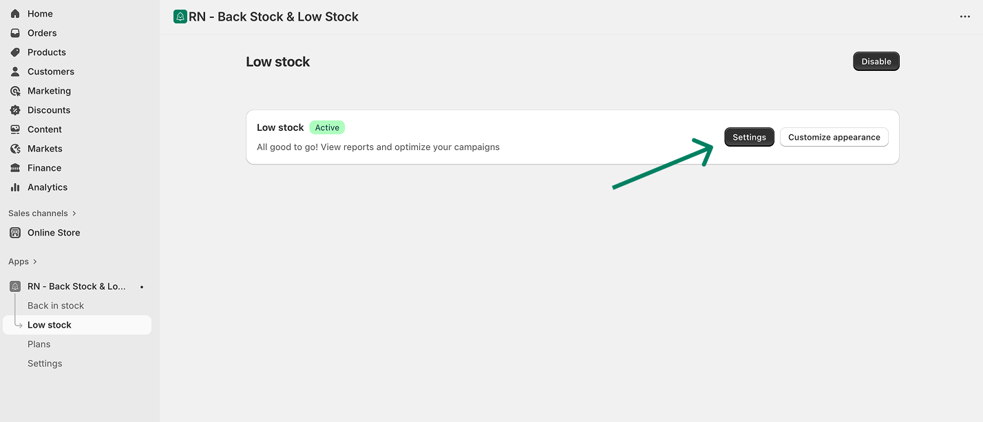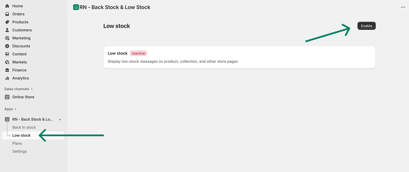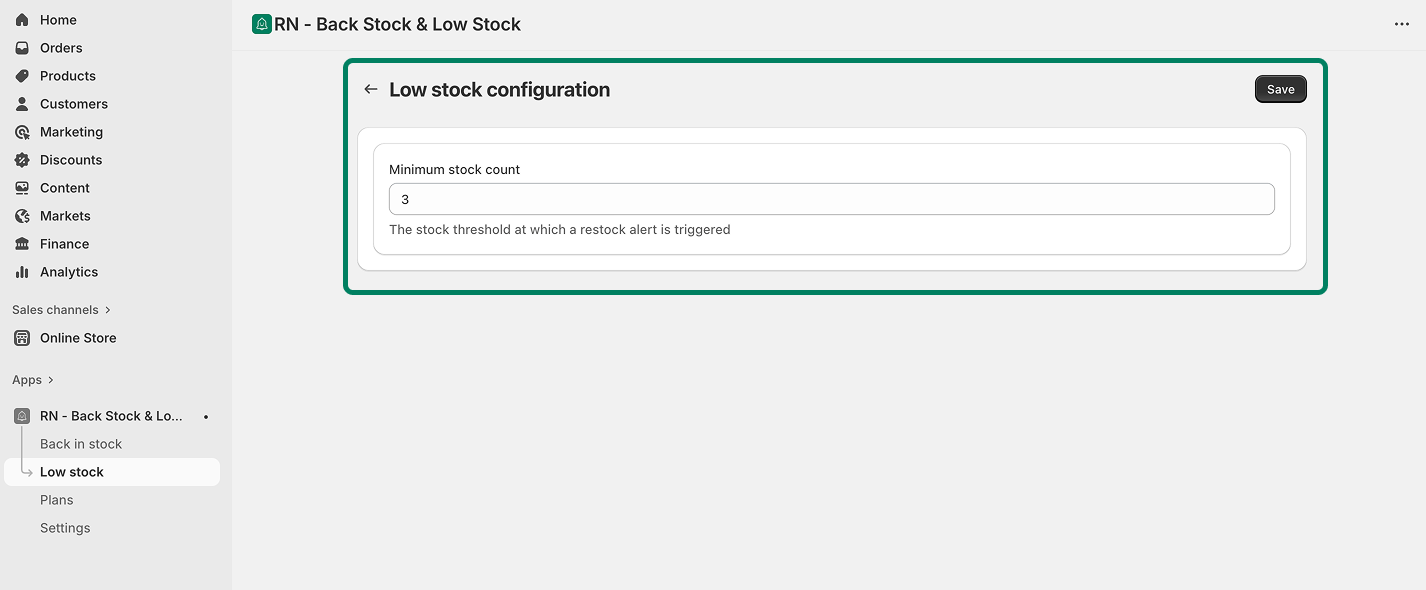 Once enabled, the message will appear automatically when stock is low (default threshold is set to 3).