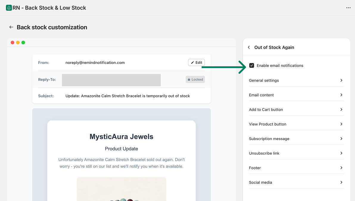 The Out of Stock Again email is sent when a product a shopper subscribed to becomes unavailable again before they buy it. You can customize this email inside the app, including its content, design, and basic behavior.