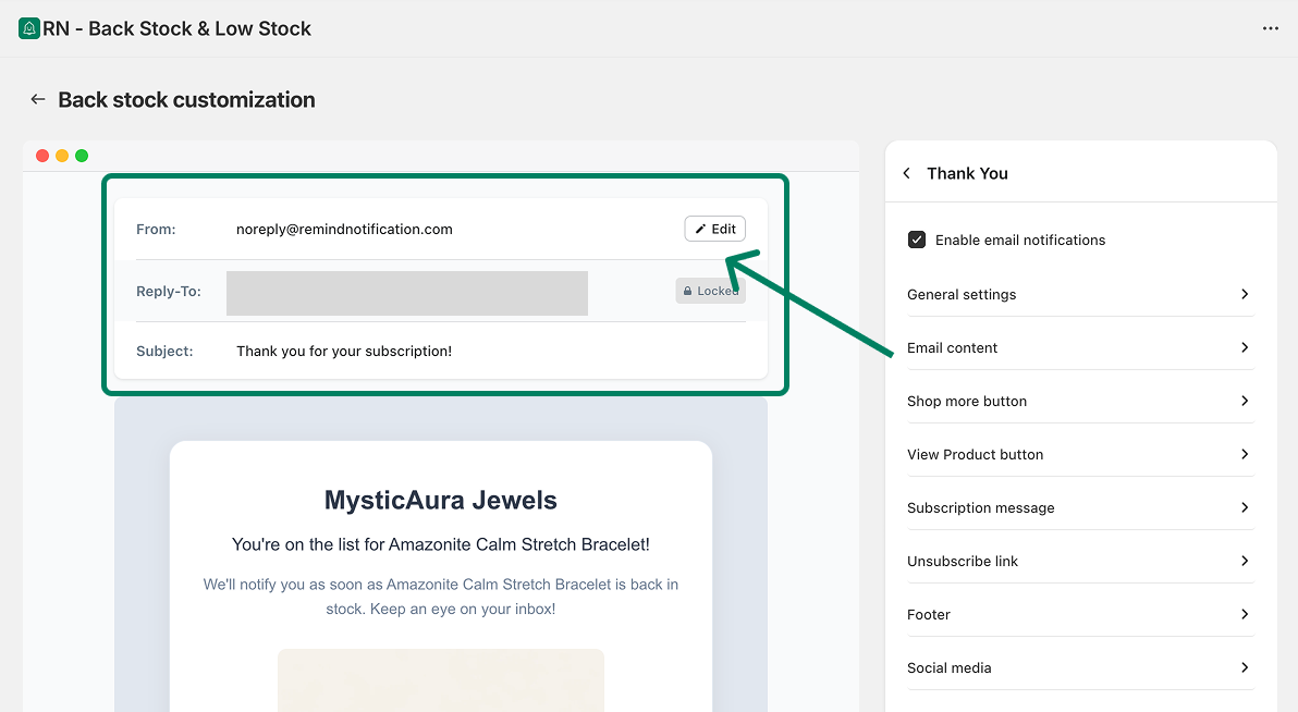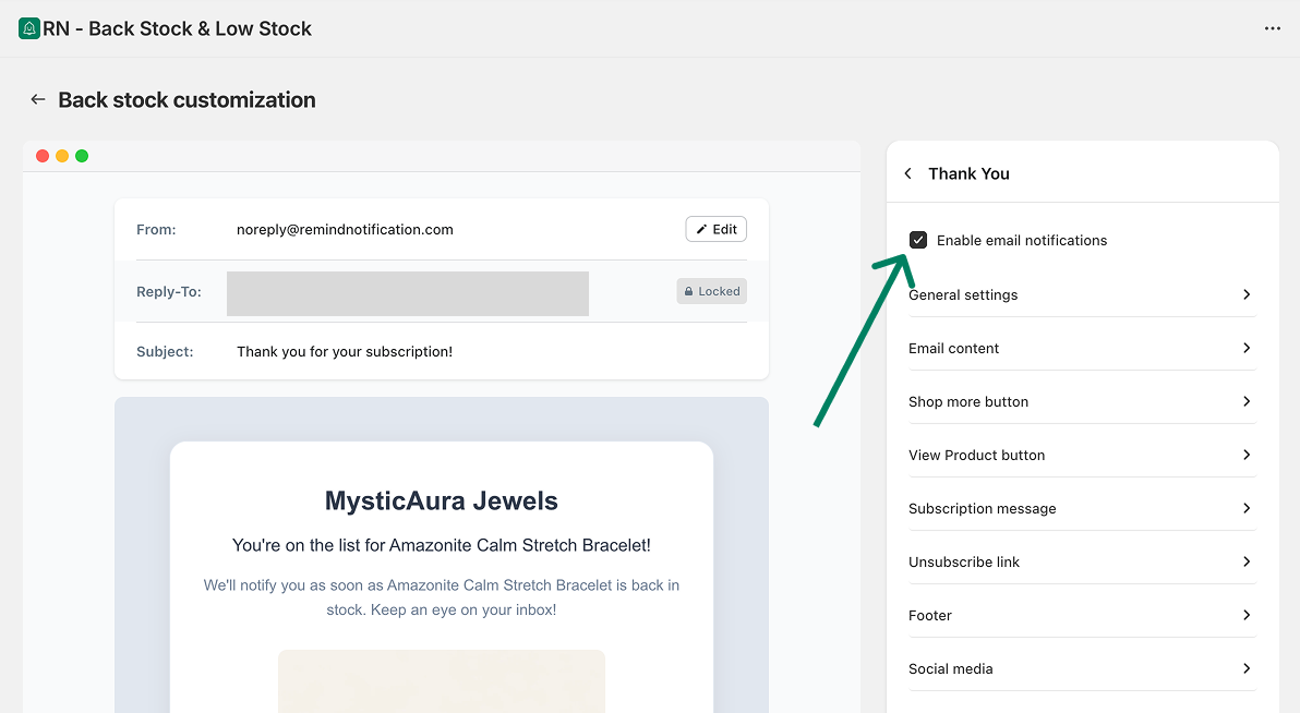 Go to Back in stock → Customize → Notifications → Thank you.