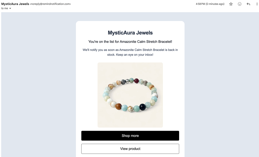 The Thank You email is the first email sent to shoppers after they subscribe using the Notify me button. It confirms their subscription and lets them know they will be notified when the product is back in stock.
